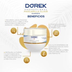 – Para tratar ocasionalmente: Dorek: Profesional Mascarilla Elixir Diamante: Tratamiento profundo para recupera los nutrientes perdidos en el cabello por los diferentes procesos químicos y ambientales, su alto contenido de aceite de argán repara los cabellos sensibilizados y quebradizos aportando suavidad y brillo intenso desde su primer uso. Contiene mix de aminoácidos y ceramidas, ideal para el mantenimiento de alisados progresivos y cuidado del color.